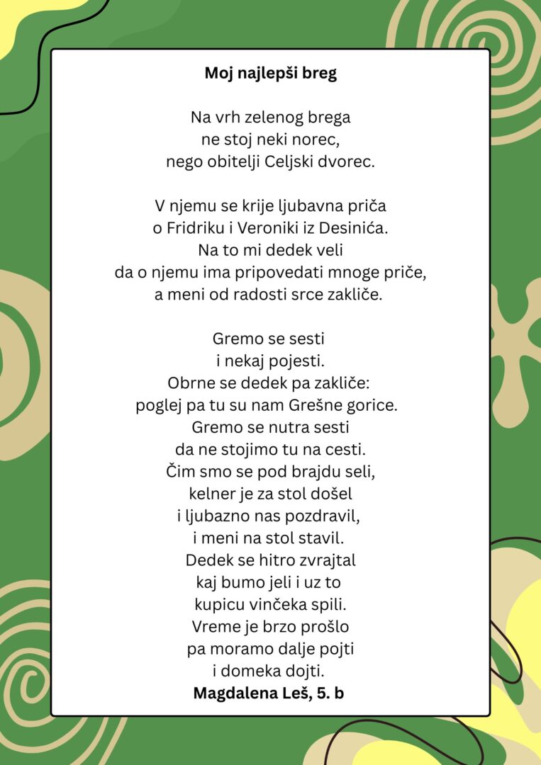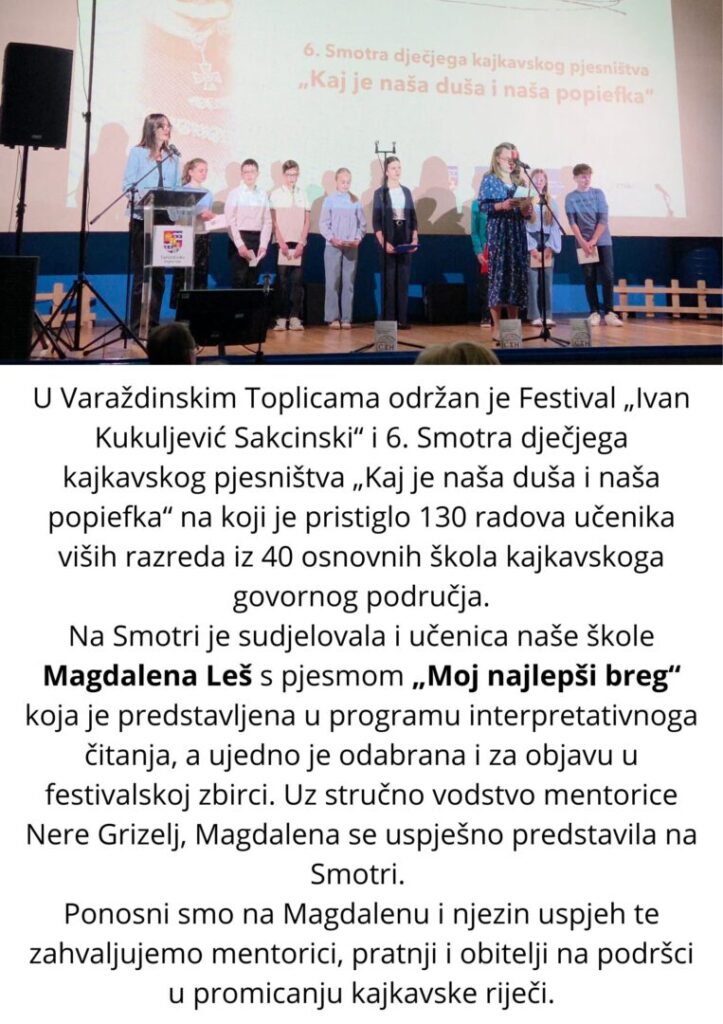 Dana 14.4.2026. učenici 6.a i 6.b razreda krenuli su na terensku nastavu u Čakovec. Krenuli su u 7:30 ujutro, a oko 10 sati došli su na vidikovac Mađerkin breg. Na vidikovcu su se slikali sa svojim razrednicima i imali prelijep pogled na prirodu i ostale države i gradove. Zatim su se zaputili u Muzej Međimurja Čakovec, a kako bi došli do njega, trebali su proći kroz prelijepi zeleni park pun cvijeća. U muzeju su vidjeli tamnice, opreme vojnika i naučili puno o obitelji Zrinski. Nakon muzeja uputili su se na radionicu Med dvemi vodami gdje su prvo pogledali njihov muzej, naučili puno o rijekama Muri i Dravi i životinjama koje žive u njima i oko njih. Zatim su se s voditeljem uputili u razgledavanje rijeke Mure. Sljedeća stanica bilo im je izletište Goričanec u kojem su ručali pohanu piletinu i krumpiriće, a za desert su dobili ukusne palačinke. Na izletištu Goričanec su nakon ručka imali 40 minuta slobodnoga vremena koje su iskoristili za druženje i igranje na velikoj livadi. Učenici su to jedva dočekali, spremni s loptama i reketima za badminton. Povratak pred školu bio je oko 18:45, a učenici su se vratili sretni i zadovoljni. Iako su im sva mjesta koja su posjetili bila vrlo lijepa i zabavna, i dalje je boravak u autobusu najzabavniji. Učenici su se lijepo proveli i svakako bi sve još jednom ponovili.